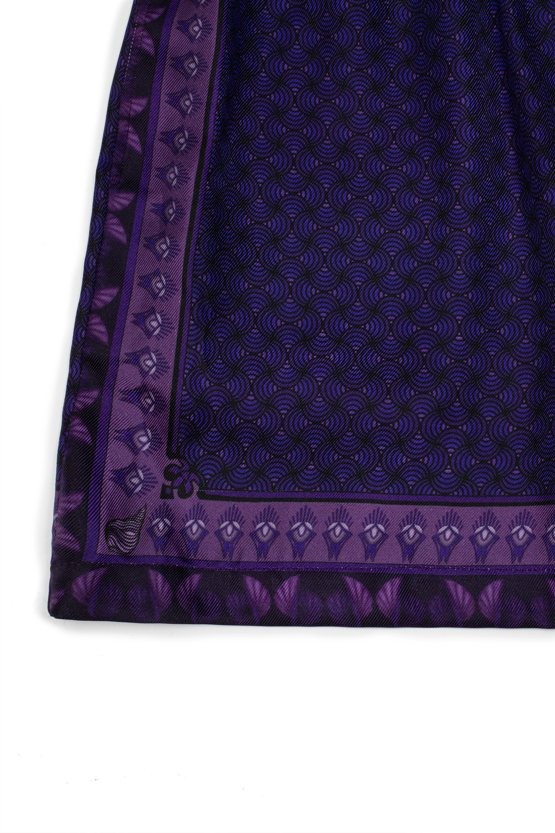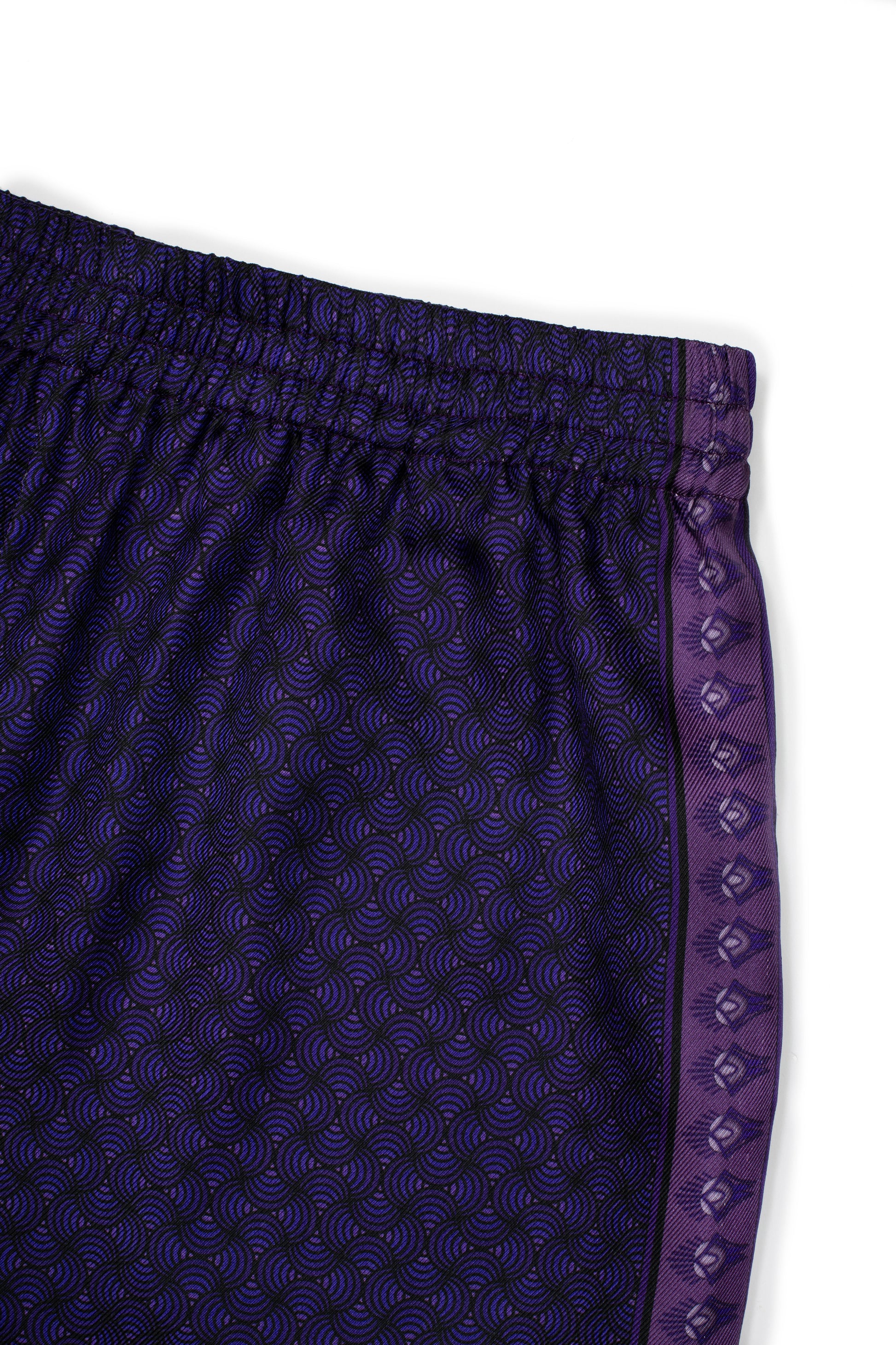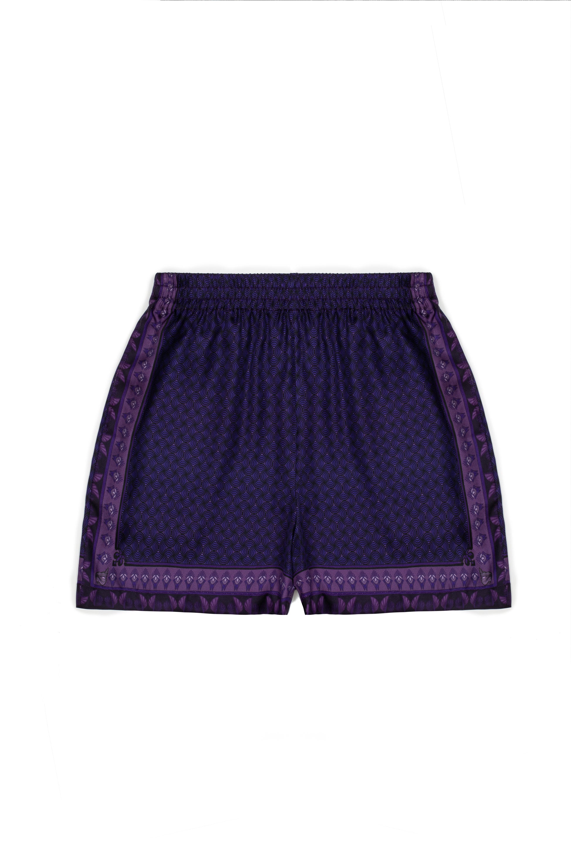 The Peur silk short feature a printed design with artwork that explores the shapes of emotions, inspired by the graceful lines and organic forms of Art Nouveau. The print is rendered in varying tones of purple, reflecting the depth and complexity of feeling. Crafted from luxurious silk twill, the shorts are finished with an elasticised waistband, in-seam side pockets, French seams, and a striped hem detail.